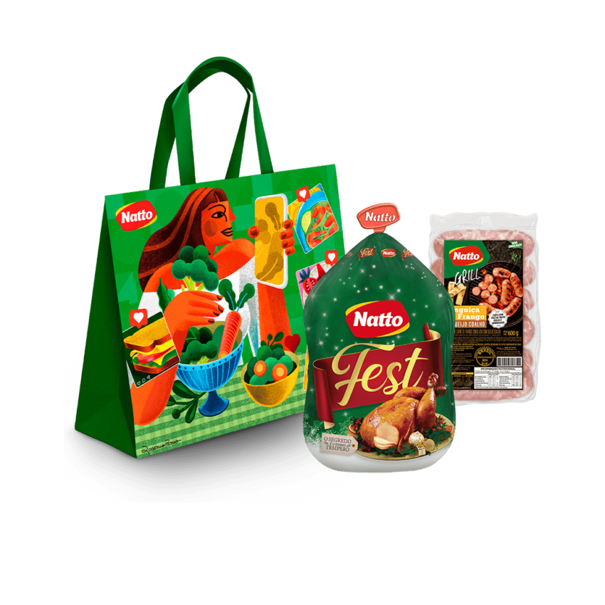 KIT NATTO FEST FESTEJE01 Sacola Térmica Capacidade de 10 Litros01 Ave Natto Fest* *Peso Variável de 3,1kg a 3,4kg Linguiça de frango com queijo coalho (600g)